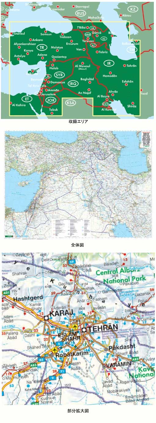 ジョージア中部からイラク・ヨルダン (北から南) 、エジプト北東部・イスタンブールからイラン西部 (西から東) までの範囲を収録。