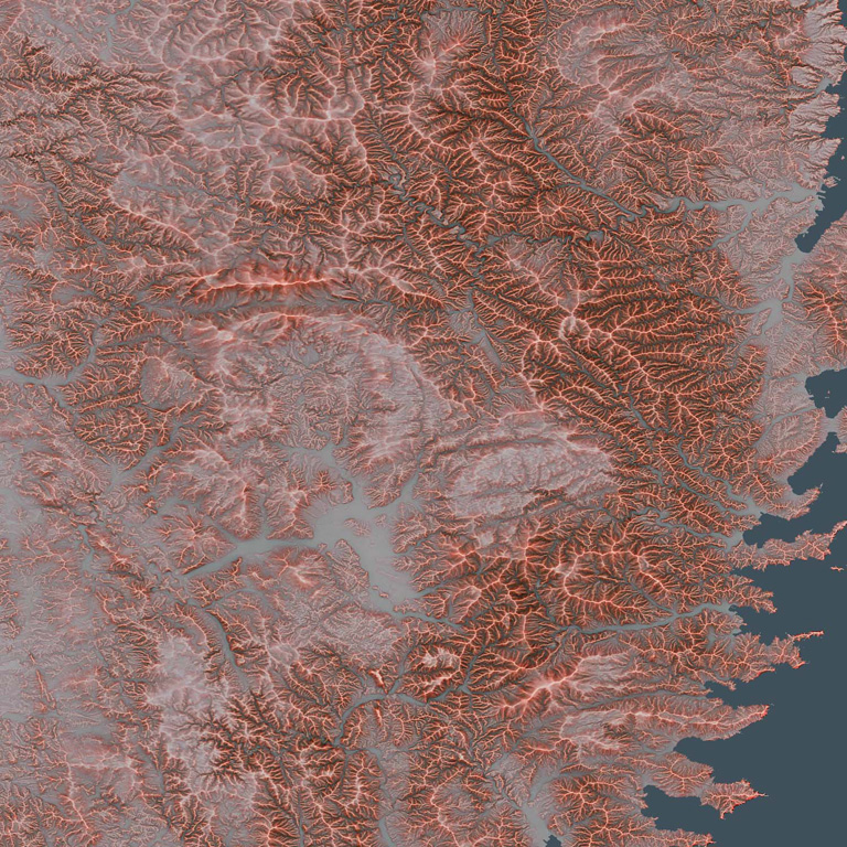 赤色立体地図rrim50は、国土地理院発行数値地図50m(標高)より生成したデジタルデータです。関東や九州など、大きなエリアを一度に見るようなときに適しています。