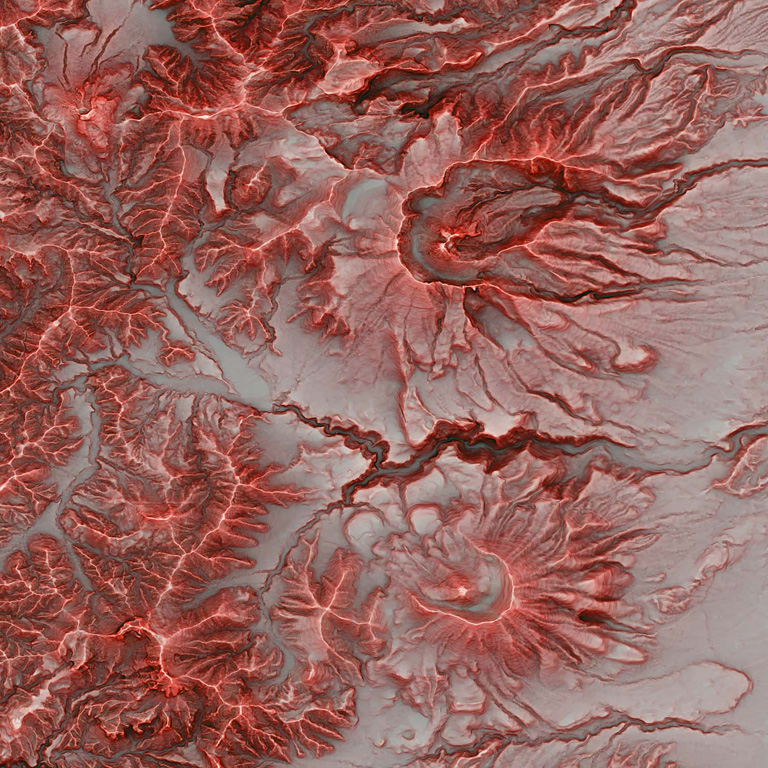 赤色立体地図RRIM10_2016は、国土地理院発行基盤地図情報(標高)10mメッシュより生成したデジタルデータです。山地を見るのに適しています。