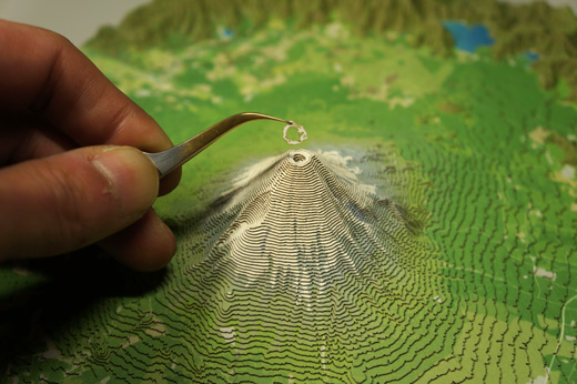 輪切りの山を積み上げるから『やまつみ』。作り方はとっても簡単!等高線で切断済みなので、順番と向きを間違えないように1枚ずつ貼り重ねて いくだけです。地図が苦手な人でも、とてもリアルな立体地図模型が出来上がります。
